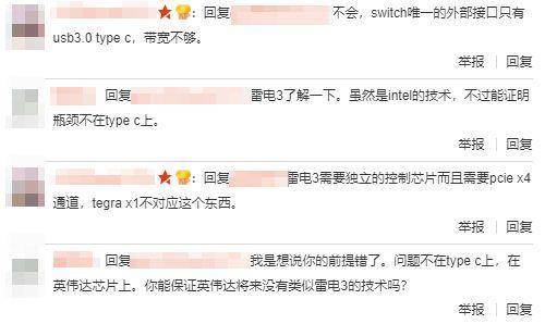 有人说,Switch 上的 Type-C 支持 Thunderbolt 3,还有人说 Nvidia 或许会提供类似雷电 3 的技术;今天我还收到了一条回复,觉得 Switch 未来会在底座上提供外接 RAM......