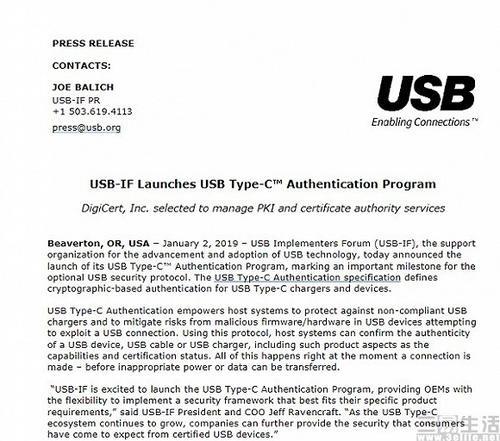 对于目前最为常见的USB Type-C接口,此次认证最重要的特色就是身份验证和安全加密,外界预计将会与苹果MFi认证线缆一样,用内置一枚芯片的方式,来通过128位加密技术以及专用的安全策略来保证接口的安全性,并减少通过USB连接的设备中包含恶意固件硬件所导致的风险。