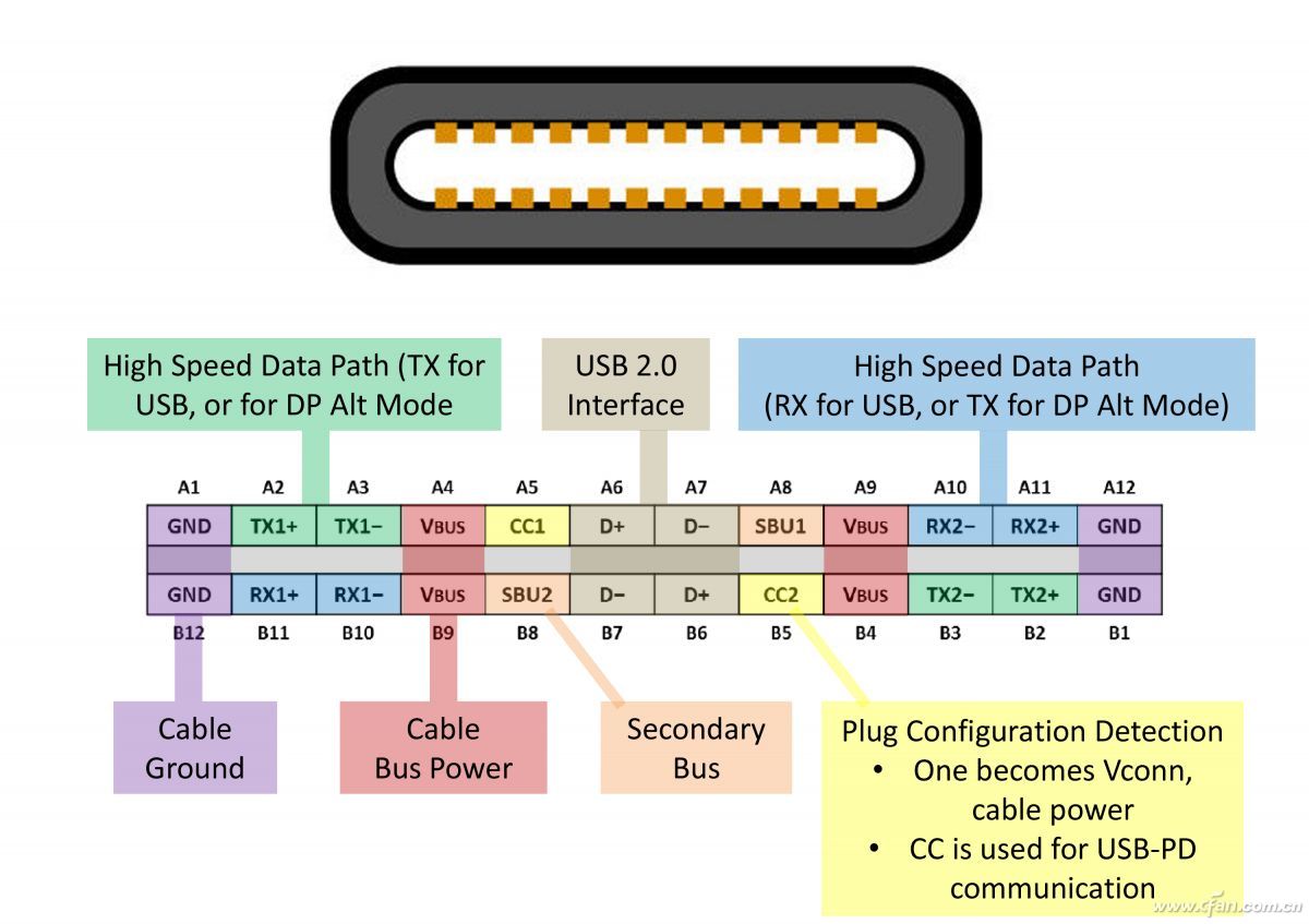 USB Type-C接口内拥有24组针脚,一根线缆支持多大的电流、多快的数据传输速度和视频输出等功能需要连接不同数量和类别