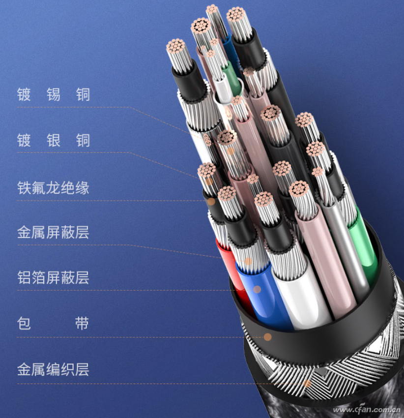对于支持5A、10Gbps数据传输和音视频输出的线缆,就需要采用10根镀锡铜芯和8根镀银铜芯设计了。如果是支持40Gbps的雷电线,还需要对镀银铜芯进行加粗。