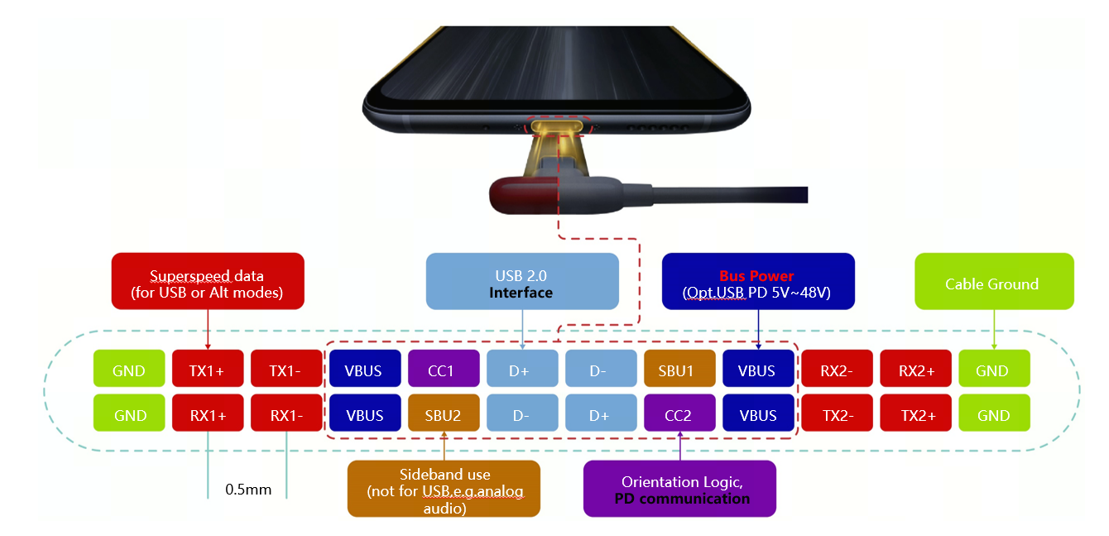 完全体的Type-C接口拥有24个引脚,采用镜像排布的功能定义,其具备以下特性: