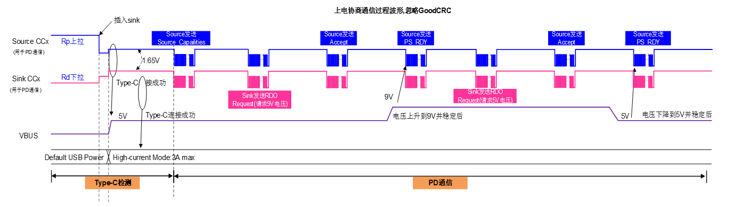 讲到这里,相信大家都已看出PD协议包含两个重要部分:Type-C检测和PD报文通讯,其中Type-C检测用于电流档位能力和角色识别,PD报文通讯主要负责调整VBUS电压和角色转换通讯。那么在不需要调整VBUS电压的应用场合,比如POS机、玩具等,我们可以选用更经济的芯片,仅支持Type-C检测功能,即:CC Logic。
