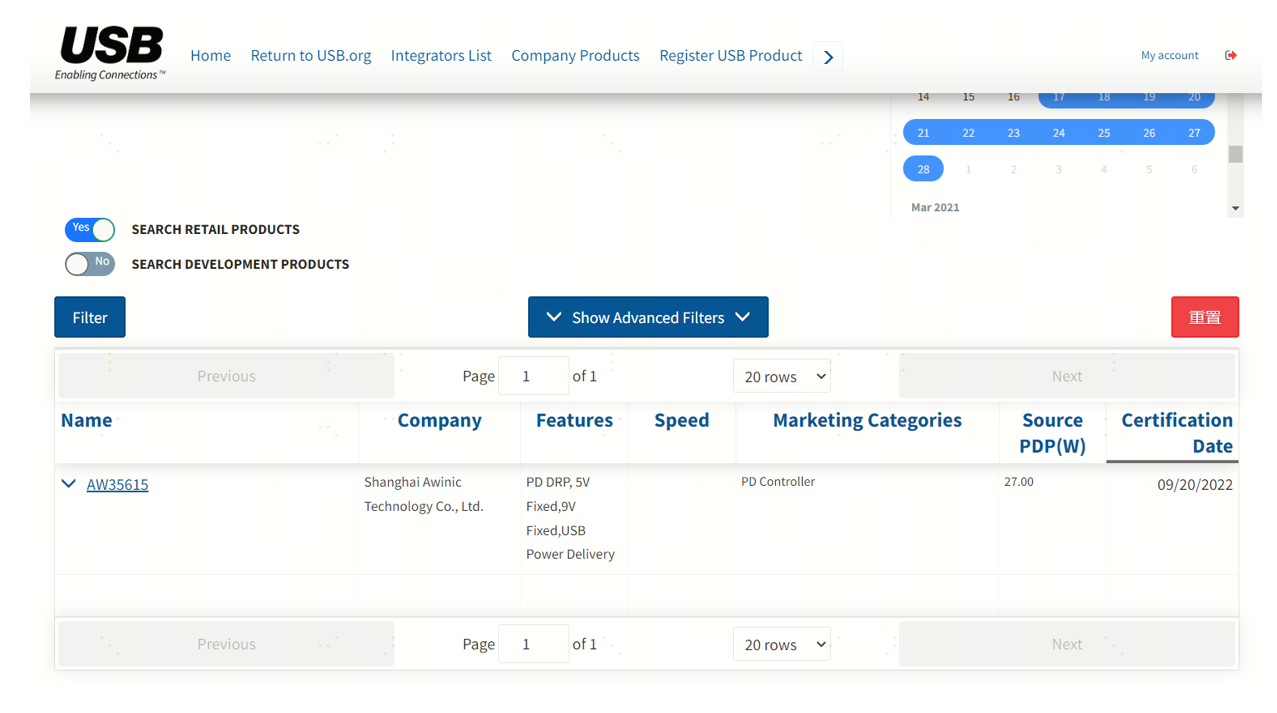 艾为为了满足大家对各个领域日益增长的PD快充需求,推出通过USB-IF协会认证的PD PHY芯片AW35615系列,其在USB-IF协会官网展示信息如下: