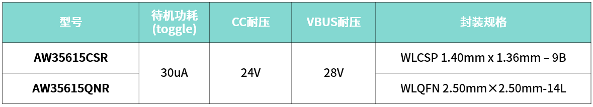 AW35615拥有两种不同封装的产品以兼容各类应用场合,其主要参数如下: