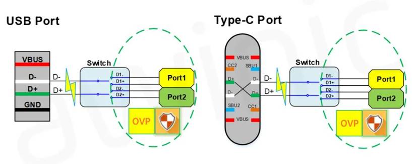 时至今日,各类基于DPDM通道的快充协议越来越丰富,USB2.0 Switch开关常用于解决快充协议芯片和AP端共用DPDM通道的情况,通过加入分时复用的功能,解决了通道竞争问题。但Switch芯片的功能不止于此,它直连端口pin脚,还肩负着将外部浪涌和ESD等危险能量“拒之门外”的责任,为了整个系统安全“操碎了心”。由于USB接口的设计原因,DPDM线与VBUS相邻设计,容易因为抖动、水汽等导致的设备口内部短路情况,在快充的情况下高压的VBUS会对D+/D-内部的低压器件造成威胁。