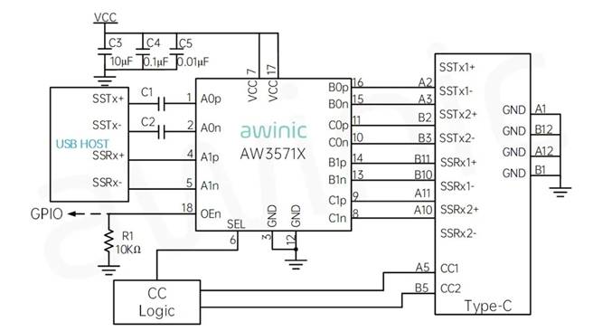 通过上表所示高速数据传输物理引进关系,可以看出当一个仅支持USB3.1或USB3.2 Gen2×1的设备插入TypeC接口后,往往需要根据CC引脚指示的正反插信息来将其与USB Host控制器建立正确的物理连接通路,如下图示。