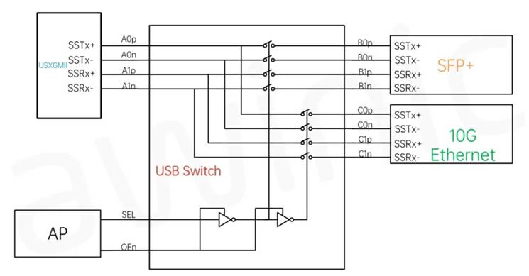 此外,USB3.x的Switch往往还肩负着将高速通道根据具体的应用场景分时复用的责任,比如在一些CPE设备中,往往需要使用Switch来切USXGMII信号。
